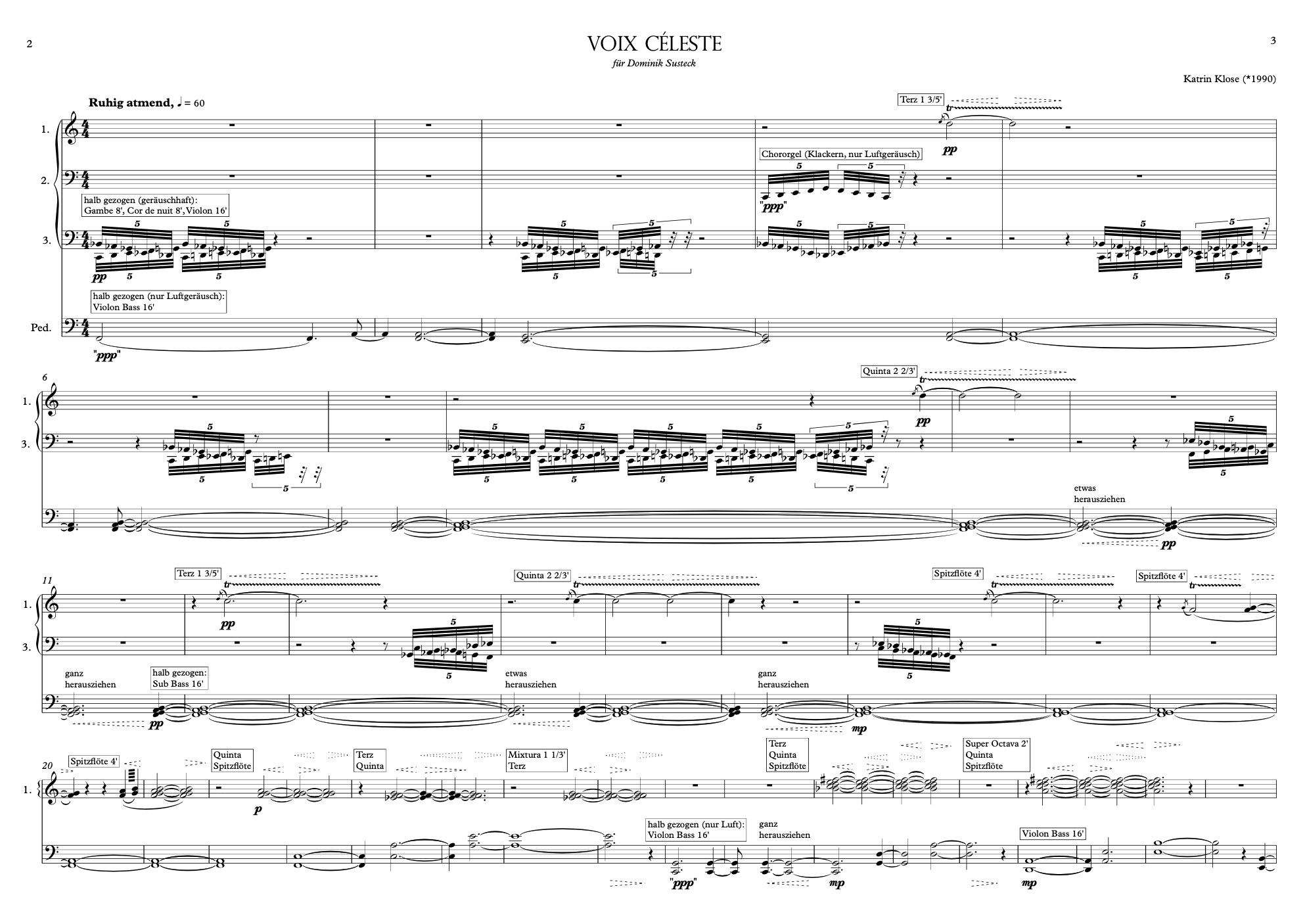 Voix céleste for organ solo was written in 2020 for a commission by the Bayerischer Rundfunk – Studio Franken for the concert series “unerHÖRT!”. Originally, the work was composed for the Goll-organ of the Neustädter Kirche in Erlangen. Hereby, I was particularly fascinated by the sound effect the stops create when only pulled half or pulled slowly. Starting with airy and windy sounds cluster chords emerge and diminish again. Then, a powerful spectral chord unfolds in all disposable registers. This chord is contrasted by a very quiet, almost unearthly epilogue which also includes the choir organ as a spatial effect.