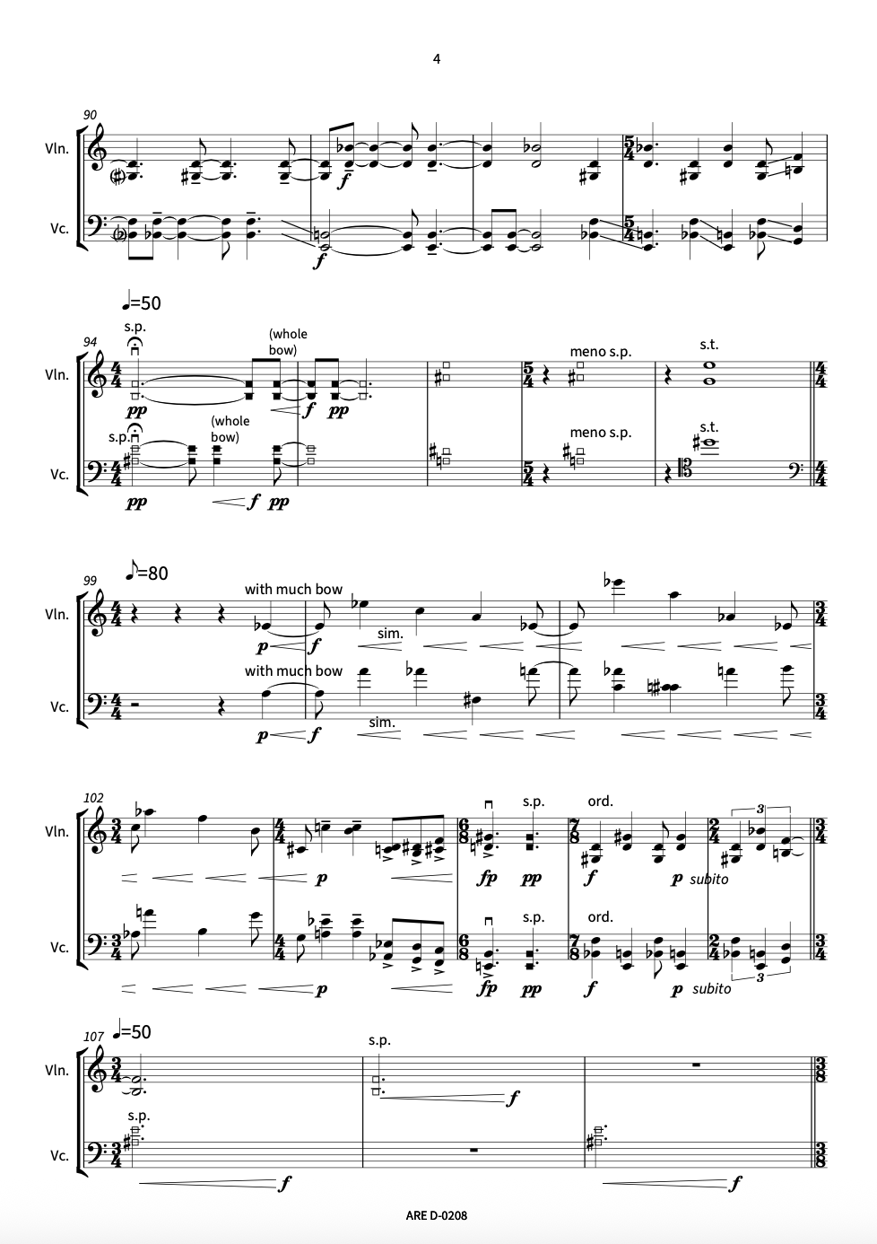 Schönheit als musikhistorischer brüchiger Begriff spielt in meinem Schaffen immer eine wichtige Rolle. Trotz der musikphilosophischen Fallstricke dieses Begriffs scheint er mir für mein Selbstverständnis als Künstler unentbehrlich. Schönheit liegt in meinem Empfinden vor allem in dem Zarten, dem Zerbrechlichen. Was schön ist, ist kostbar und kann so leicht zerstört werden. Die Kombination von Violine und Cello spiegelt diese Zerbrechlichkeit wieder: zwei Holzkörper, die einen filigranen, aber keinen massigen Klang erzeugen können, mehr Aquarell- als Acrylfarbe. Selbst mit zwei Instrumenten sind schon farbenreiche vierstimmige Akkorde möglich, die hier wie einzelne Pinselstriche aufs Blatt gesetzt sind. Das die Schönheit jedoch dauerhaft in Gefahr ist, zeigen die Klänge, die plötzlich wie ein Schattenecho mit starken “sul ponticello”-Spiel erklingen, quietschend und unruhig. Die Dunkelheit lauert eben doch hinter der nächsten Ecke…